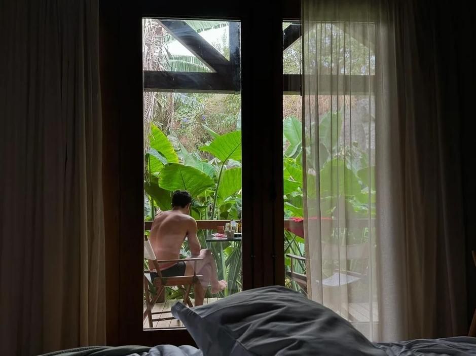 Por su parte, el hijo de Ricardo se dejó ver en ropa interior mientras desayunaba en el balcón del lugar donde se hospedan, rodeado por la naturaleza.