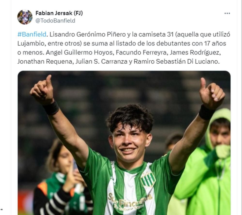 Según una publicación del periodista Fabian Jersak, del programa radial "Todo Banfield", el caso es que Lisando Piñero se suma a la lista de los debutantes con 17 años o menos que integran otros cinco jugadores:
