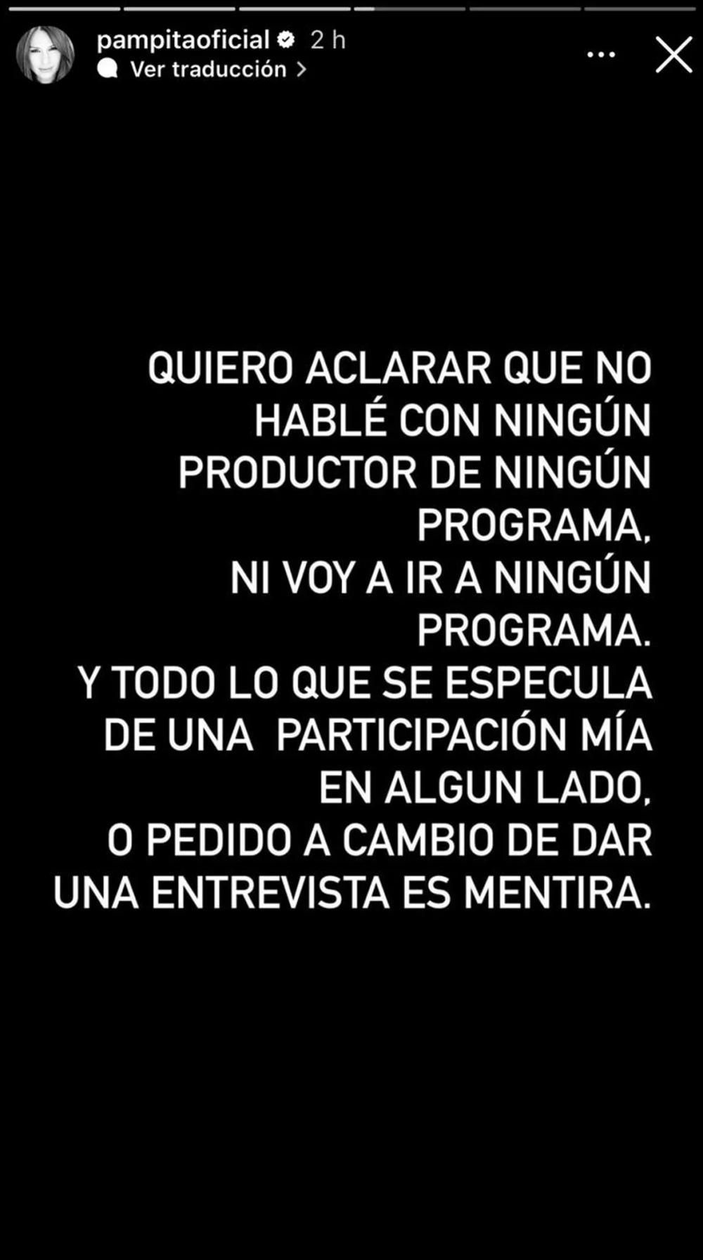 Ante la creciente presión mediática, Pampita nuevamente apeló a Instagram para desmentir los rumores sobre su participación en programas de televisión relacionados con la separación.