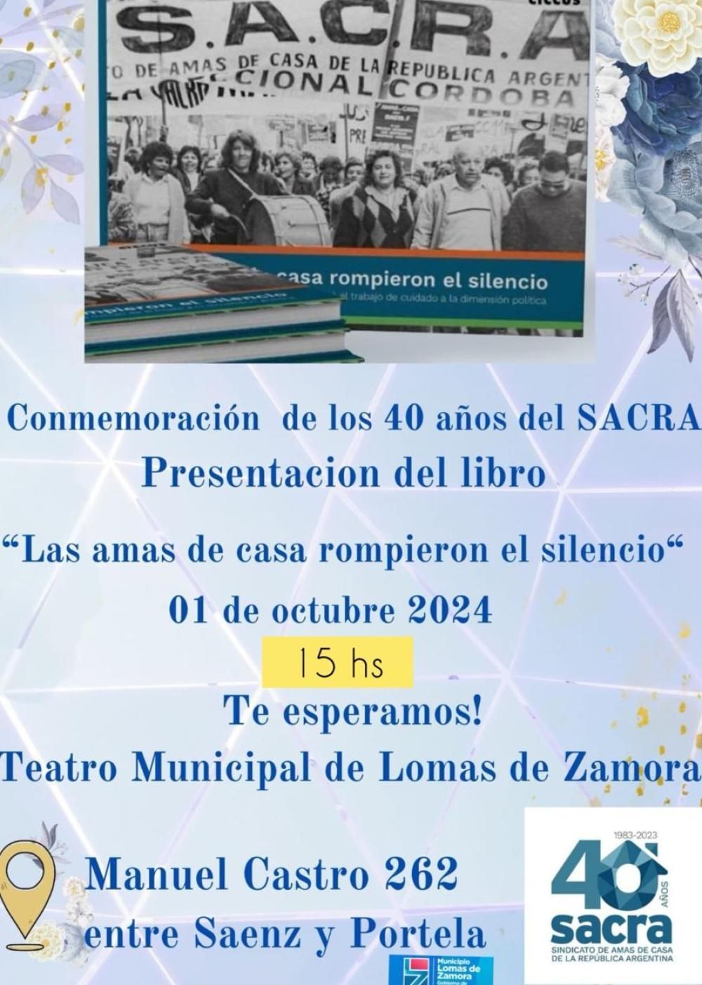 Un encuentro destinado a conmemorar los 40 años de la creación del Sindicato de Amas de Casa de la República Argentina (SACRA) se va a desarrollar este martes a las 15 en el Teatro del Municipio ubicado en Manuel Castro 262, Lomas.
