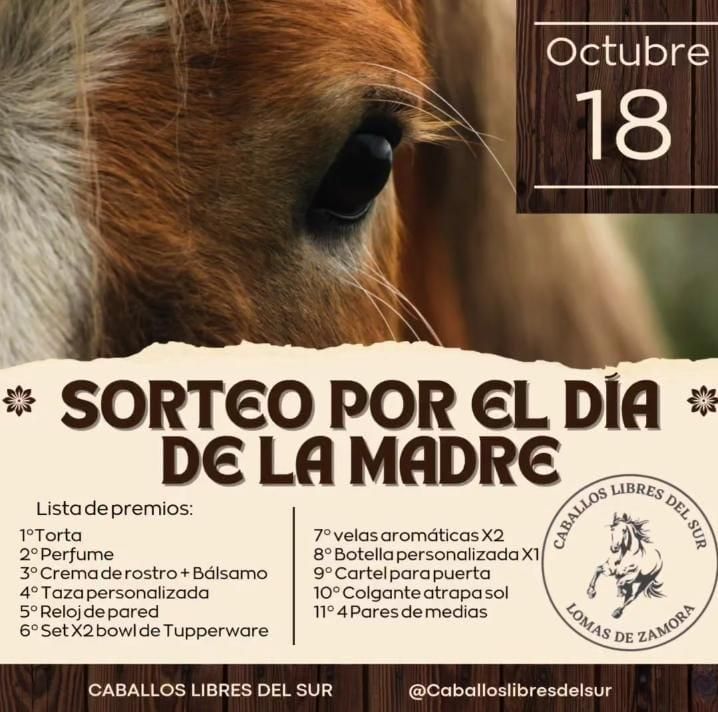 La ONG lomense Caballos Libres del Sur lanzó oficialmente una rifa por el Día de la Madre, con la que intentarán juntar fondos para seguir mejorando el hogar de los animales rescatados por violencia o por tracción a sangre. Los números ya están a la venta: los ganadores se conocerán el próximo viernes 18 de octubre.