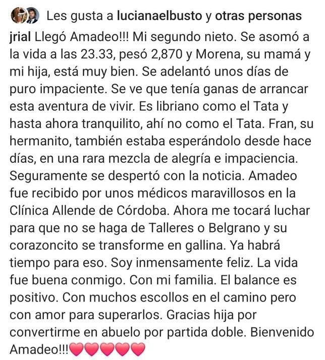 "Es libriano como el Tata y hasta ahora tranquilito, ahí no como el Tata. Fran, su hermanito, también estaba esperándolo desde hace días, en una rara mezcla de alegría e impaciencia. Seguramente se despertó con la noticia. Amadeo fue recibido por unos médicos maravillosos en la Clínica Allende de Córdoba. Ahora me tocará luchar para que no se haga de Talleres o Belgrano y su corazoncito se transforme en gallina (River Plate). Ya habrá tiempo para eso. Soy inmensamente feliz", escribió.