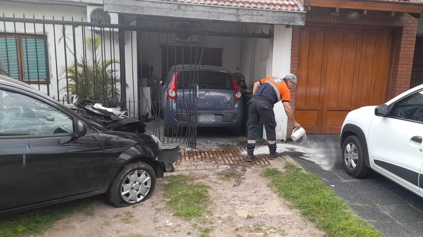 La parte delantera del coche quedó destruida por el impacto, mientras que las rejas del portón se torcieron a causa del fuerte golpe. Adentro de la casa había otro auto estacionado que por pocos centímetros no fue alcanzado por el choque.