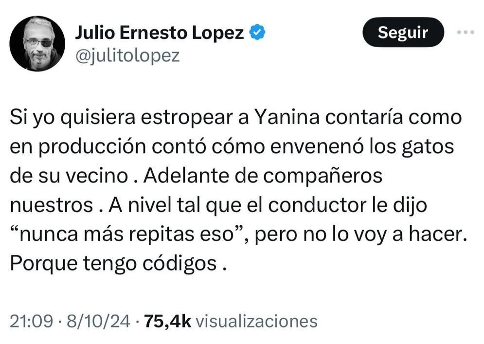 "Si yo quisiera estropear a Yanina, contaría como en producción contó cómo envenenó a los gatos de su vecino. Adelante de compañeros nuestros. A nivel tal que el conductor le dijo "nunca más repitas eso", pero no lo voy a hacer. Porque tengo códigos", dijo irónico.