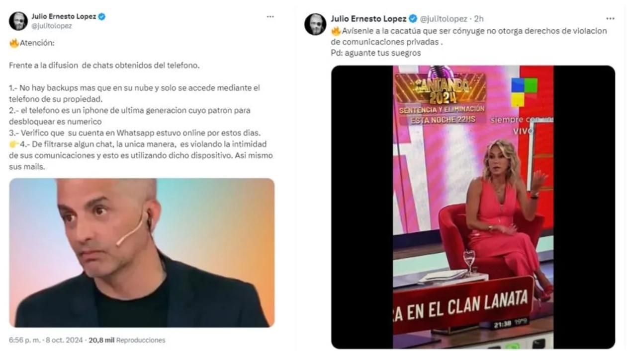 "Frente a la difusión de chats obtenidos del teléfono. 1- No hay backups más que en su nube y solo se accede mediante el teléfono de su propiedad. 2- El teléfono es un IPhone de última generación cuyo patrón para desbloquear es numérico 3- Verifico que su cuenta en Whatsapp estuvo online por estos días. 4- De filtrarse algún chat, la única manera, es violando la intimidad de sus comunicaciones y esto es utilizando dicho dispositivo. Así mismo, sus mails", escribió en X.