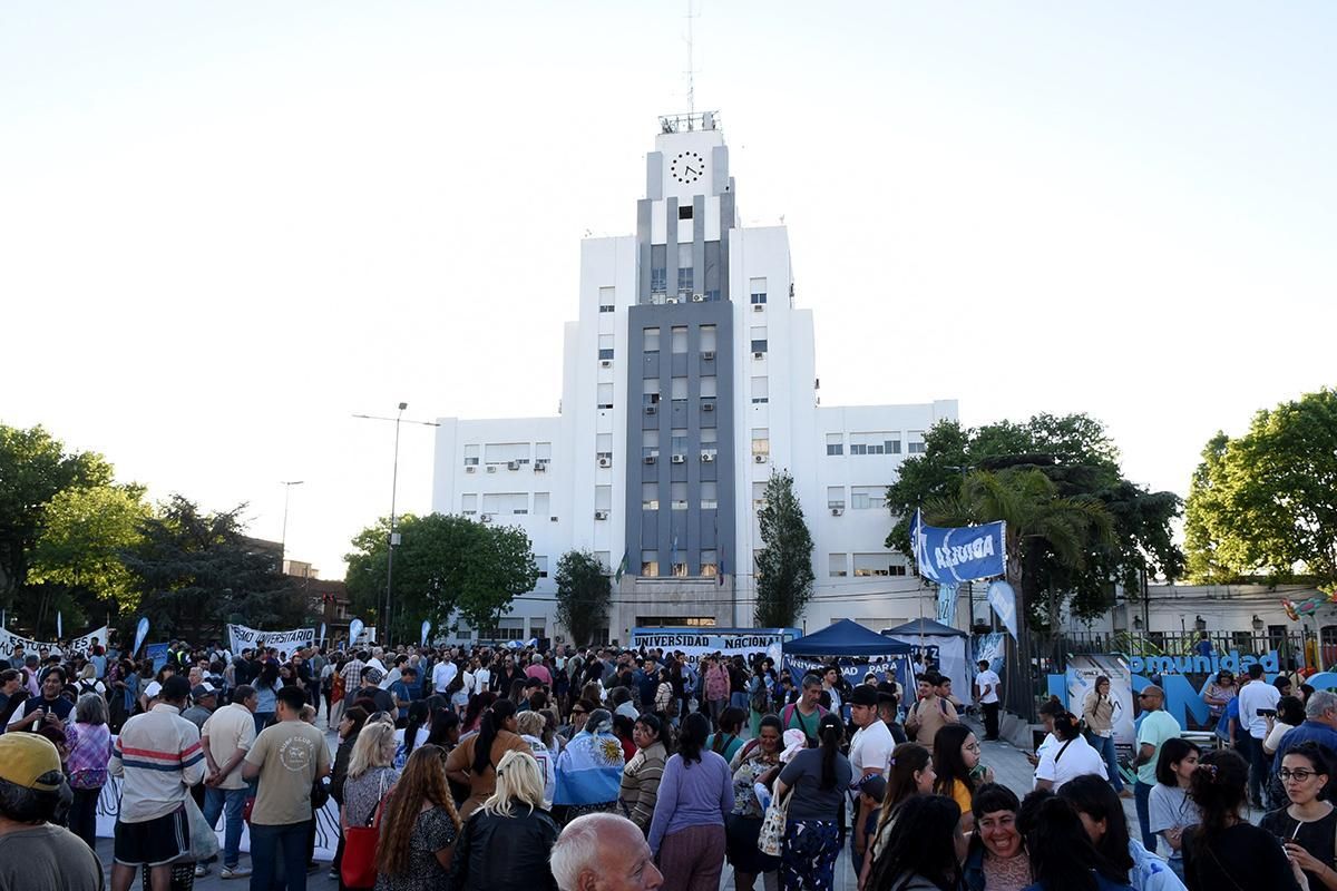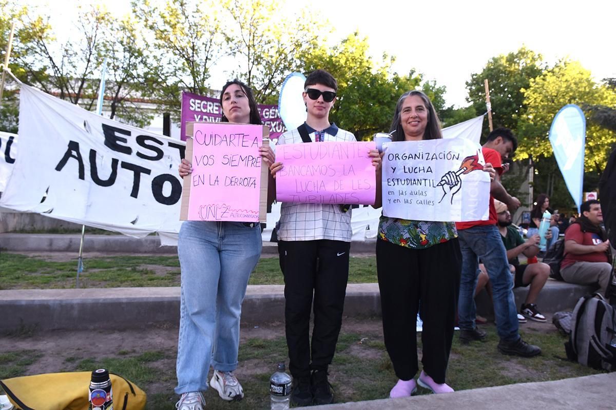 "Abajo el veto, arriba los estudiantes" fue una de las consignas que llevaron los jóvenes a una plaza que estuvo llena de banderas, pancartas y que también tuvo el acompañamiento de jubilados. El cierre fue con un acto encabezado por diferentes autoridades y decanos de las cinco facultades.
