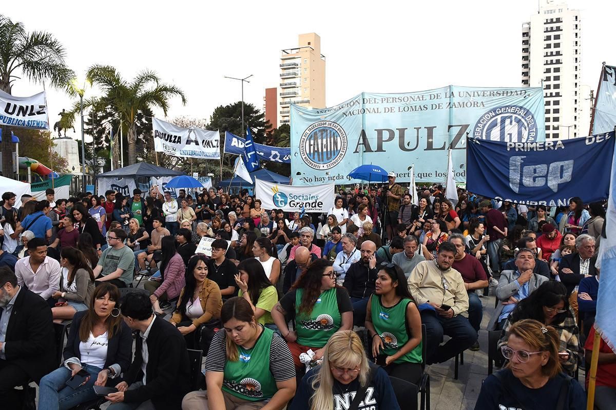 El encuentro en la Plaza Grigera fue organizado por la Federación Universitaria de Lomas de Zamora (FULZ), Asociación del Personal de la Universidad de Lomas (APULZ), Asociación de Docentes e Investigadores de la Universidad de Lomas (ADIULZA) y las agrupaciones que componen los centros de estudiantes de las cinco facultades.
