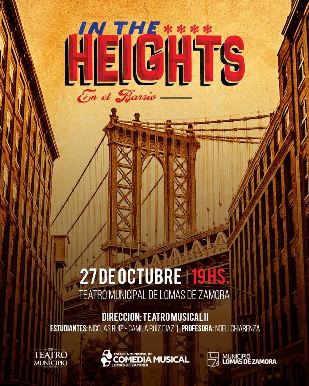 Noelí Chiarenza, quien es docente de la Escuela de Comedia Musical hace 13 años y directora de la cátedra "Teatro Musical II" donde se creó el espectáculo, habló con el Diario La Unión y contó que "In the Heights" cuenta con la dirección de los alumnos Camila Ruiz Díaz y Nicolás Ruiz, siendo un espectáculo para todo público.