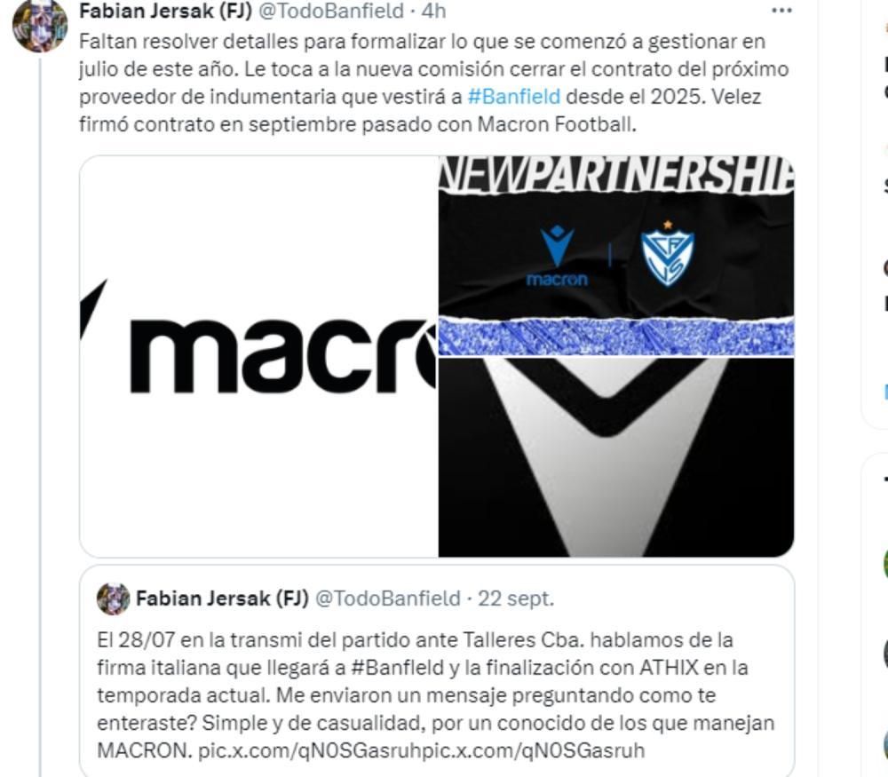 "Faltan resolver detalles para formalizar lo que se comenzó a gestionar en julio de este año. Le toca a la nueva comisión cerrar el contrato del próximo proveedor de indumentaria que vestirá a #Banfield desde el 2025. Vélez firmó contrato en septiembre pasado con Macron Football", afirmó el periodista, especializado en la actualidad del club, Fabián Jersak.