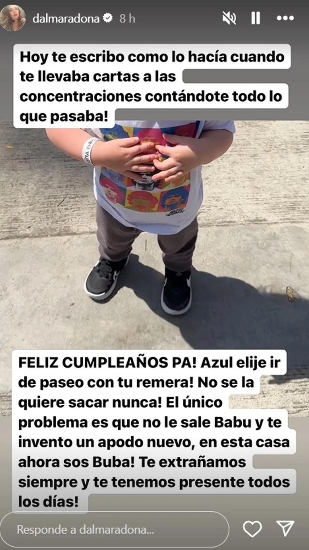La hija mayor del "10" recordó a su papá al mostrar cómo su hija Azul le rindió homenaje a su abuelo con una remera de él. La actriz también es mamá de Roma, fruto de su relación con Andrés Caldarelli.
