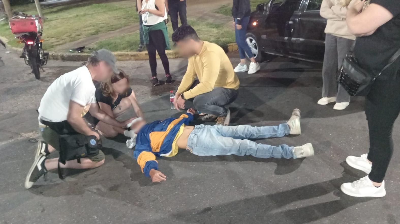 El impacto provocó que el motociclista cayera sobre el asfalto. La secuencia fue vista por algunos vecinos que se acercaron de inmediato a asistirlo. Lo primero que hicieron fue cruzar un auto en esa esquina para bloquear el paso y que nadie atropellara al joven repartidor.
