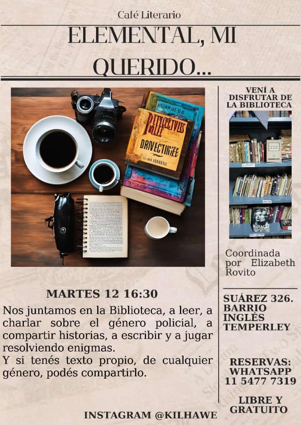 La coordinación del café literario estará a cargo de la coordinadora Elizabeth Rovito, quien en el marco de la biblioteca se va a poder leer y charlar sobre el género policial que tiene tantos adeptos.