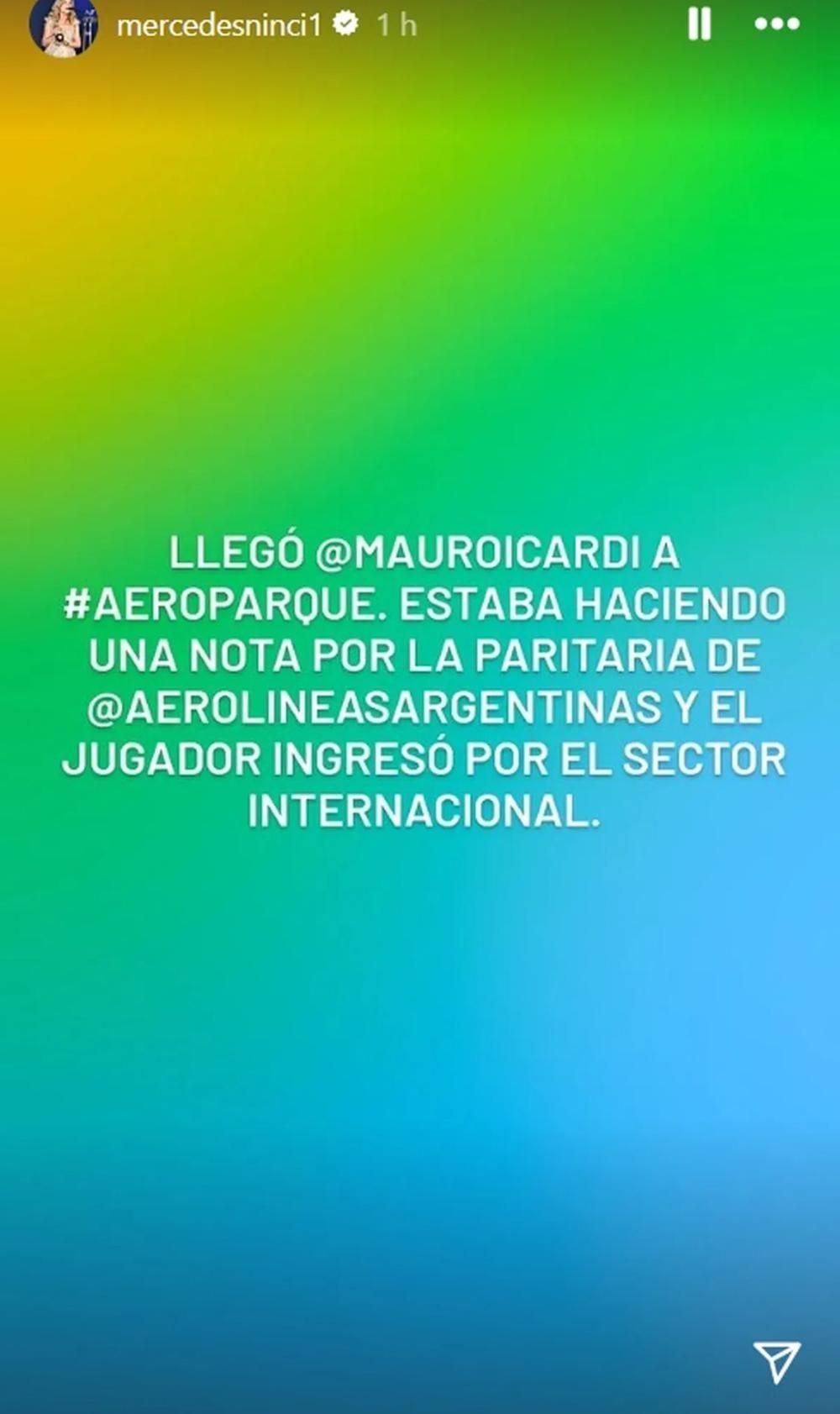 Luego, Mercedes Ninci contó las redes para dar más detalles sobre este tema: "Llegó @mauroicardi a #Aeroparque. Estaba haciendo una nota por la paritaria de @AerolineasArgentinas y el jugador ingresó por el sector internacional", posteó en Instagram Stories.