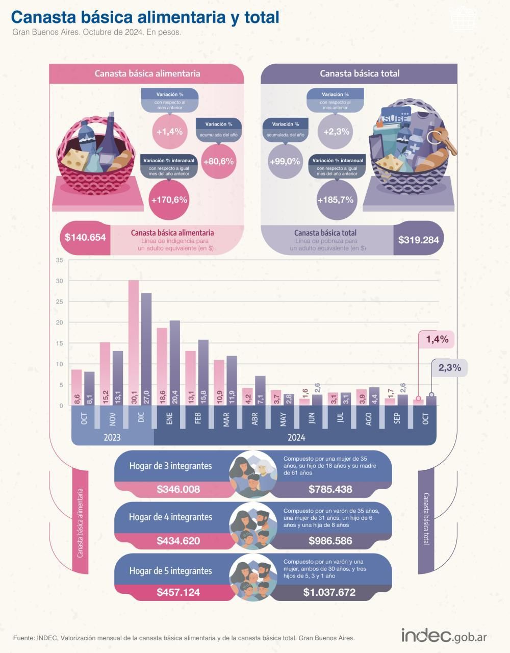 Una familia tipo necesitó ingresos por $986.586 en octubre para no ser pobre, según el Indec. Durante octubre, la variación mensual de la canasta básica alimentaria (CBA) fue de 1,4% mientras que la de la canasta básica total (CBT) fue de 2,3%.