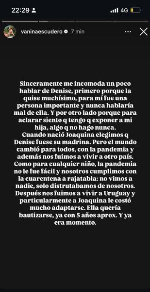 Por su parte, Vanina Escudero utilizó sus redes sociales para explicar su versión de los hechos. La bailarina aseguró que la decisión de cambiar a la madrina se debió a la distancia geográfica y a la falta de contacto entre Denise y Joaquina durante la pandemia.