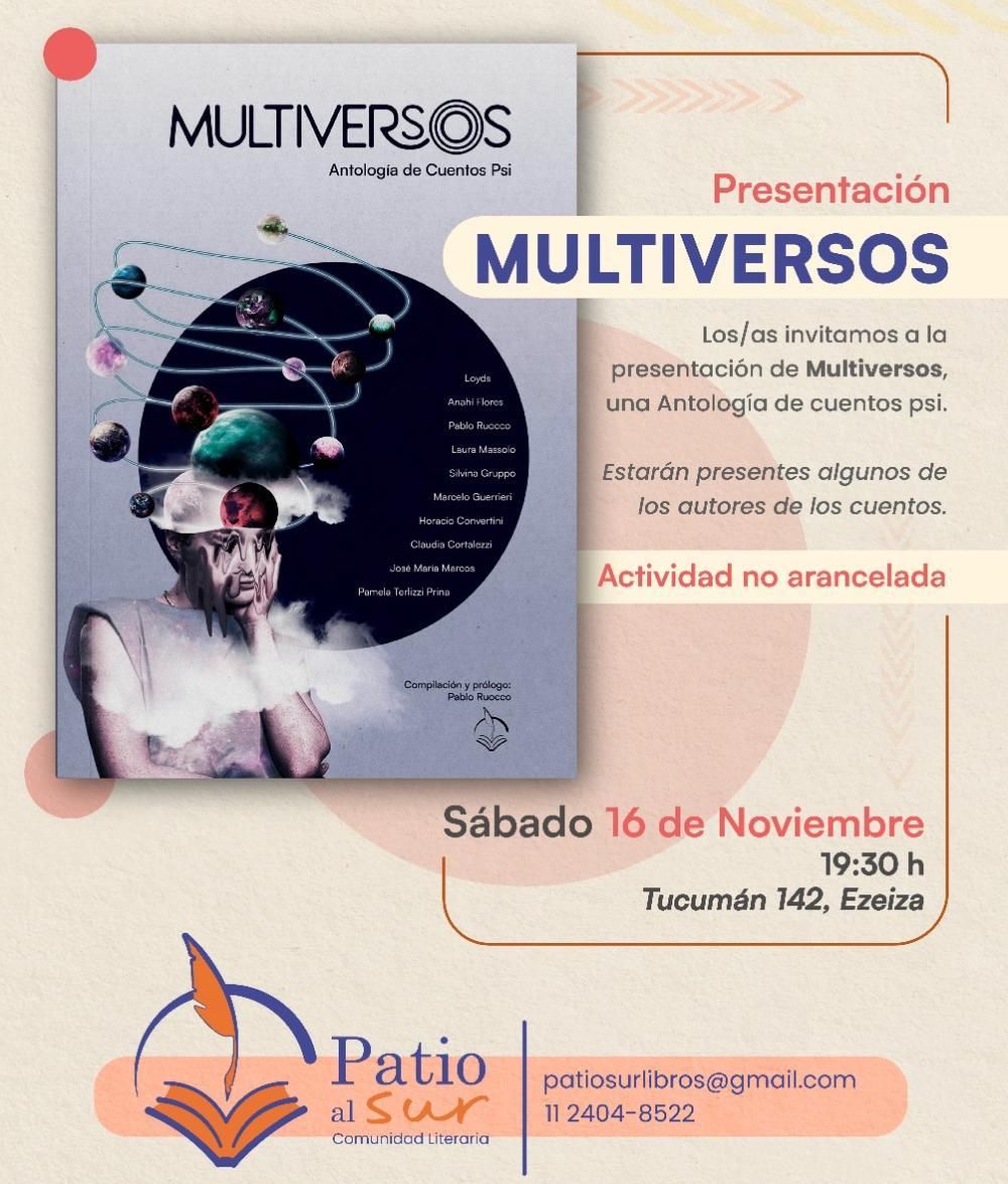 Patio al Sur Ediciones presenta "Multiversos", una antología de cuentos psi compilado por Pablo Ruocco, el sábado a las 19.30 en Tucumán 142, en Ezeiza, con entrada gratuita.