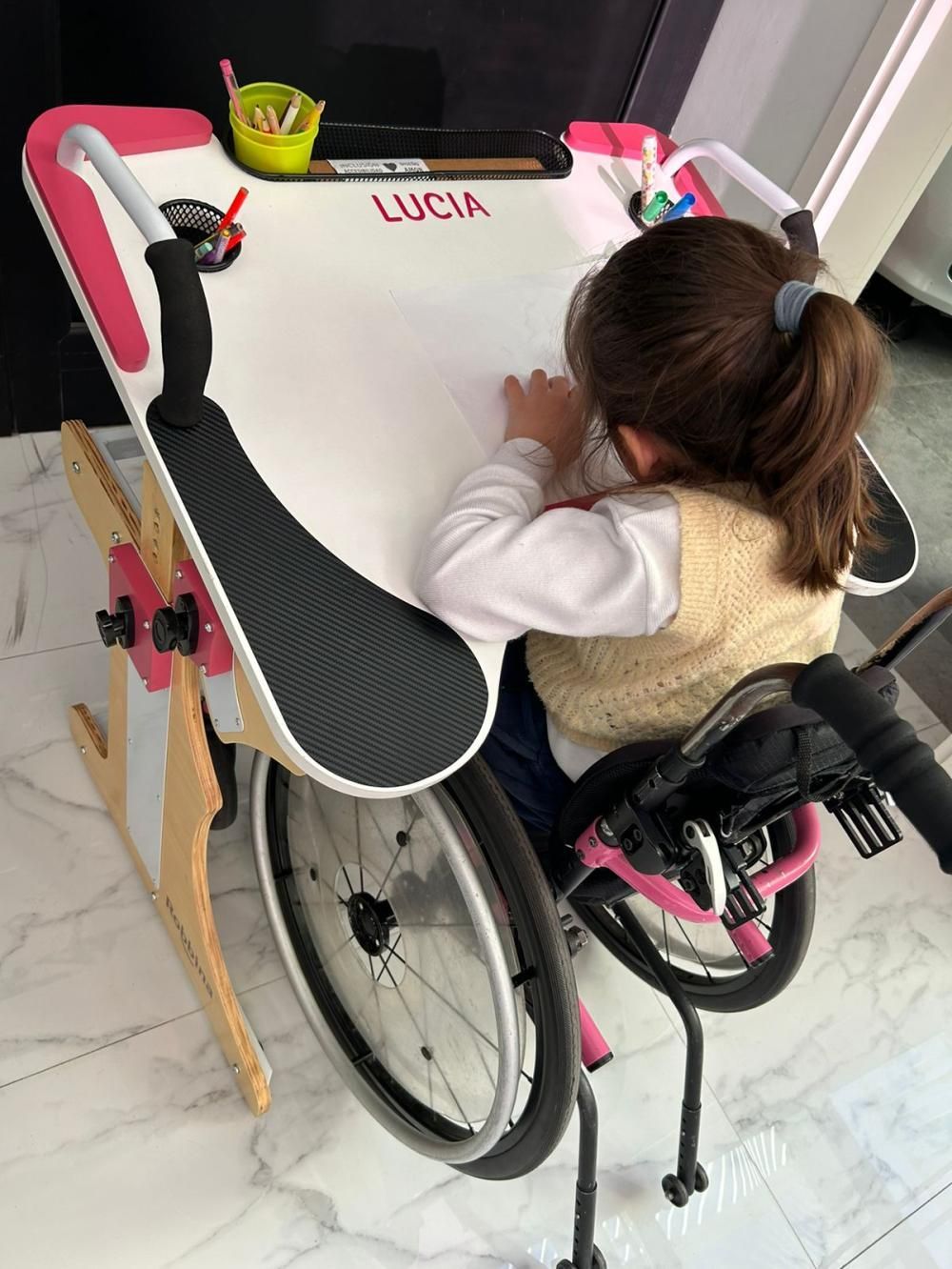 "En 2018, todo eso se transformó en un emprendimiento en el que desarrollamos productos pensados para la diversidad de personas, logrando las primeras ventas. La mesa, que es nuestro motor del concepto, tiene regulación en altura y en inclinación, diferentes accesorios para promover la autonomía y la independencia de los chicos con discapacidad: está pensada como un elemento lúdico que permite hacer actividades recreativas, educativas, de terapia o de la vida diaria", detalló.