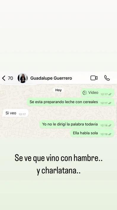 Dos minutos después, el delantero le informó a la abogada: "Se está preparando leche con cereales, yo no le dirigí la palabra todavía, ella habla sola". Al pie de la imagen, señaló: "Se ve que vino con hambre y charlatana".