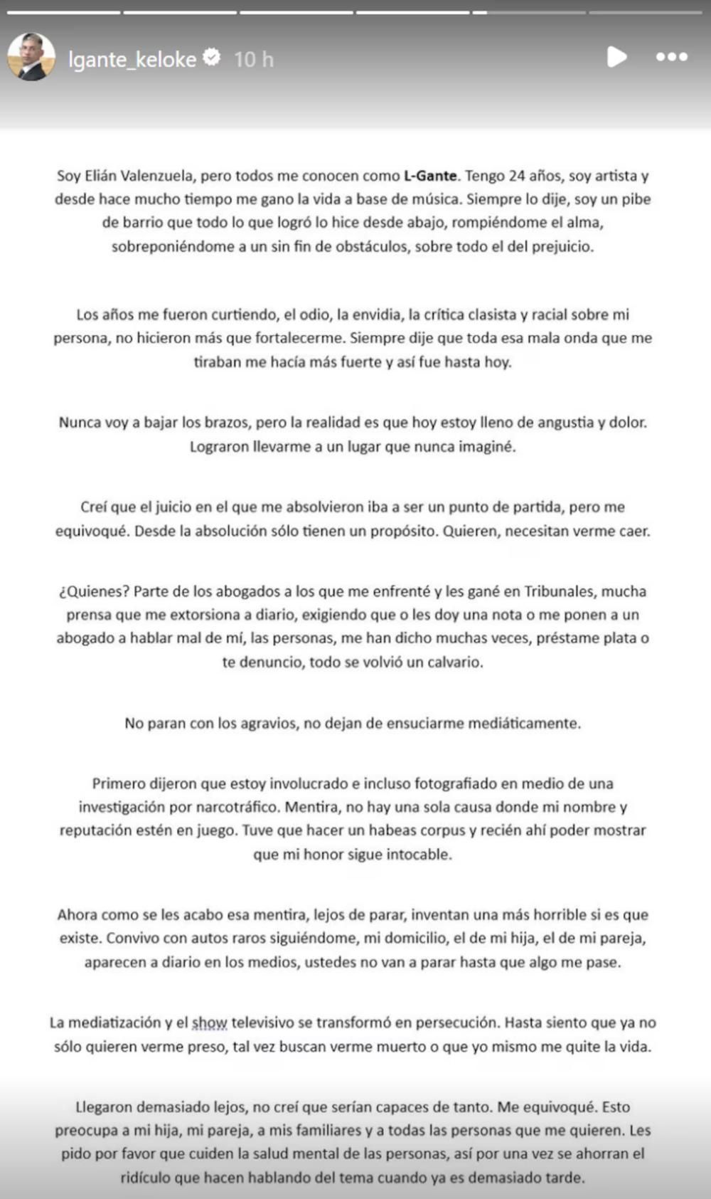 "Soy Elián Valenzuela, pero todos me conocen como L-Gante. Tengo 24 años, soy artista y desde hace mucho tiempo me gano la vida a base de música. Siempre lo dije, soy un pibe de barrio que todo lo que logró fue desde abajo, rompiéndose al alma, sobreponiéndose a un sin fin de obstáculos, sobre todo el del prejuicio", dijo en un comunicado que compartió en Instagram.