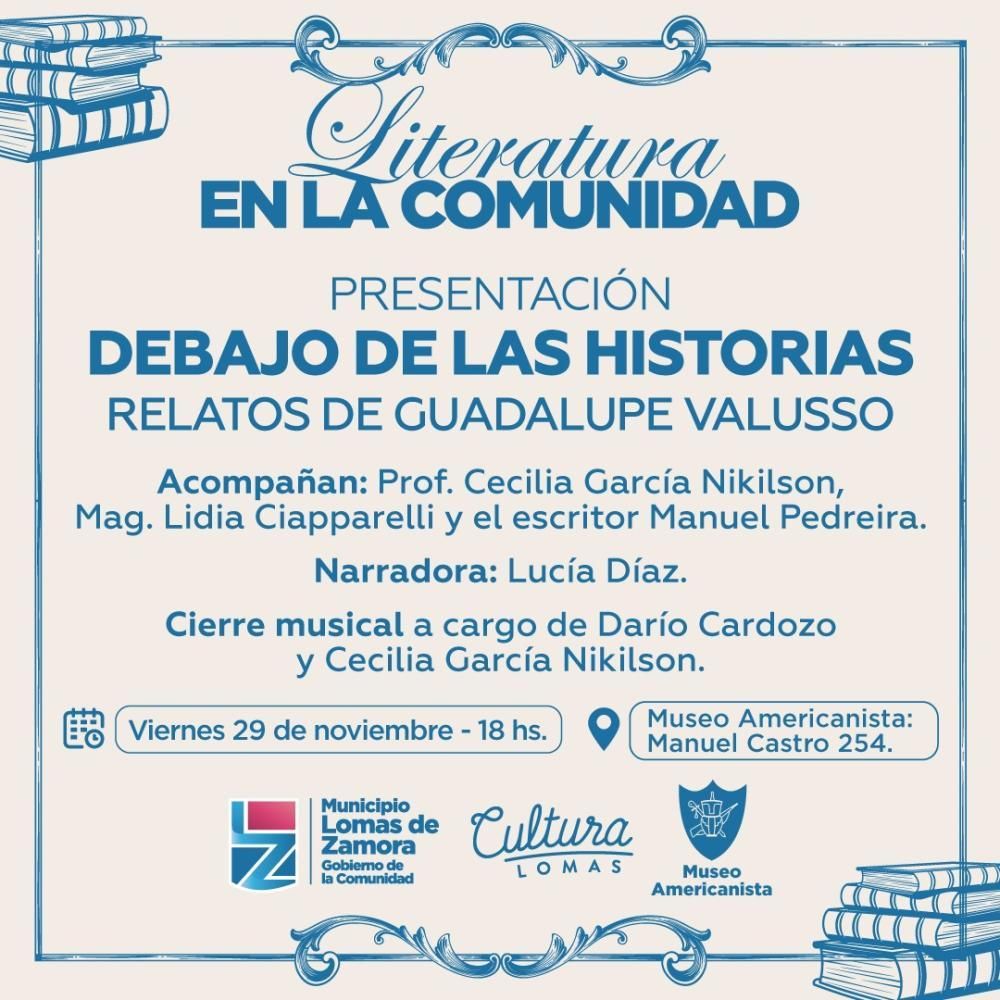 El ciclo "Literatura en la comunidad" invita a los vecinos a ser parte de la presentación del libro "Debajo de las historias", de la escritora Guadalupe Valusso. El evento, que se realizará este viernes es totalmente abierto y gratuito, donde los asistentes tendrán la posibilidad de escuchar relatos literarios de la autora.
