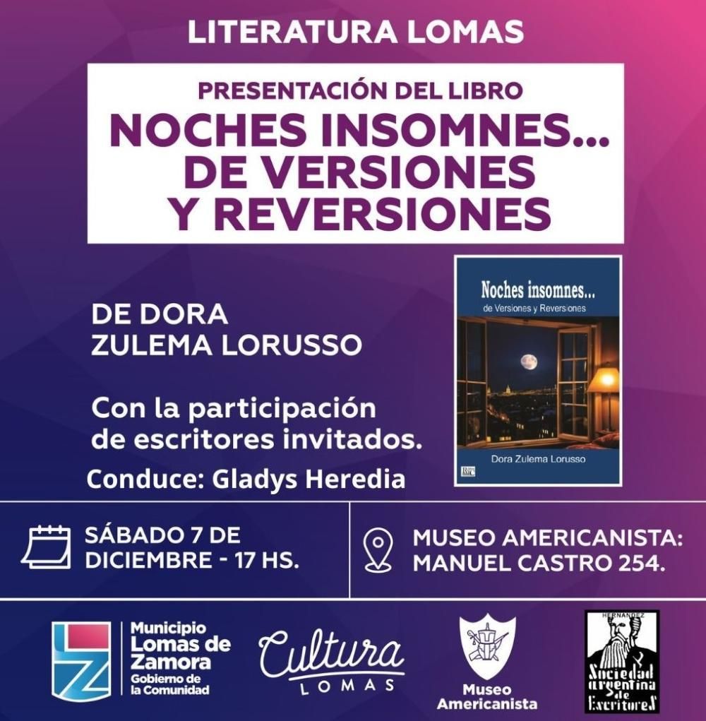 Tras recibir un gran reconocimiento por parte del Concejo Deliberante de Lomas por una de sus obras literarias, la escritora Dora Zulema Lorusso presentará este sábado a las 17 su último libro "Noches insomnes...de versiones y reversiones" en el Museo Americanista (Manuel Castro 254) con entrada libre y gratuita.