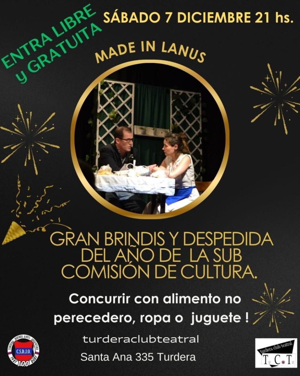 El Club Social y Deportivo Juventud Obrera de Turdera cerrará el 2024 en grande y a pura cultura: este sábado se subirá a las tablas "Made in Lanús", donde los vecinos también podrán disfrutar de un brindis de despedida de año. El evento es con entrada libre y gratuita y se pide concurrir con alimentos no perecederos, ropa o juguetes.