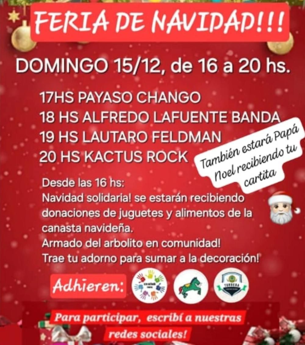 Una jornada cargada de actividades organizan en Turdera gracias al trabajo en conjunto de los vecinos, los artesanos de la feria, los artistas, los chicos de la SEJU y de todos los que este domingo, de 16 a 20, en la Plaza San Martín van a presentar un evento abierto a la comunidad para festejar la Navidad.