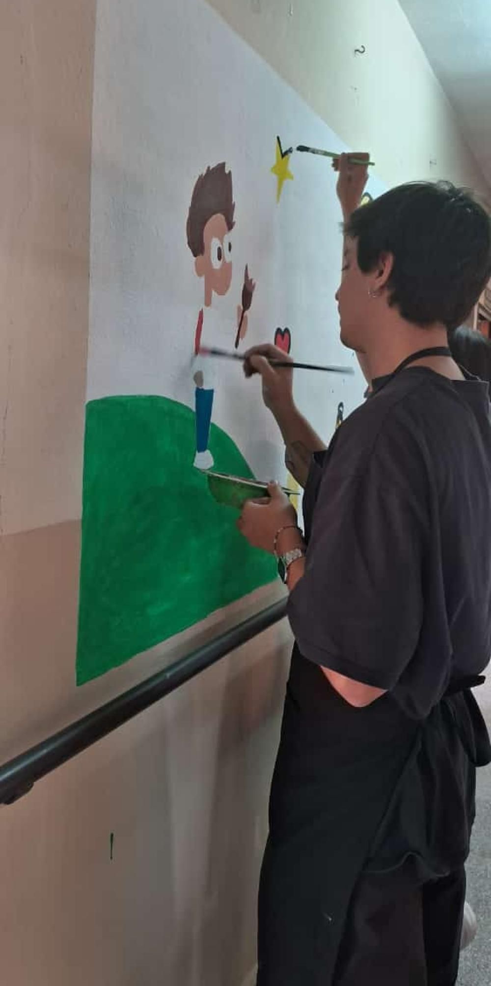 El mural está ubicado en uno de los pasillos del hall de entrada de la institución situada en Intendente Tavano 186: fue intervenido tanto por Juan y Daniela como también por algunos integrantes de la escuela especial.