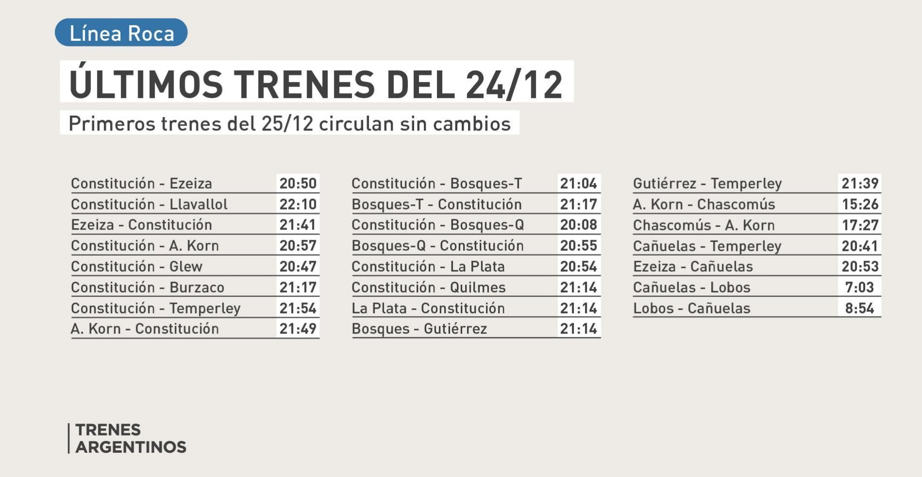 La empresa Trenes Argentinos confirmó cómo funcionará el servicio de la Línea Roca durante la Nochebuena y Navidad. Habrá algunos cambios en los horarios.
