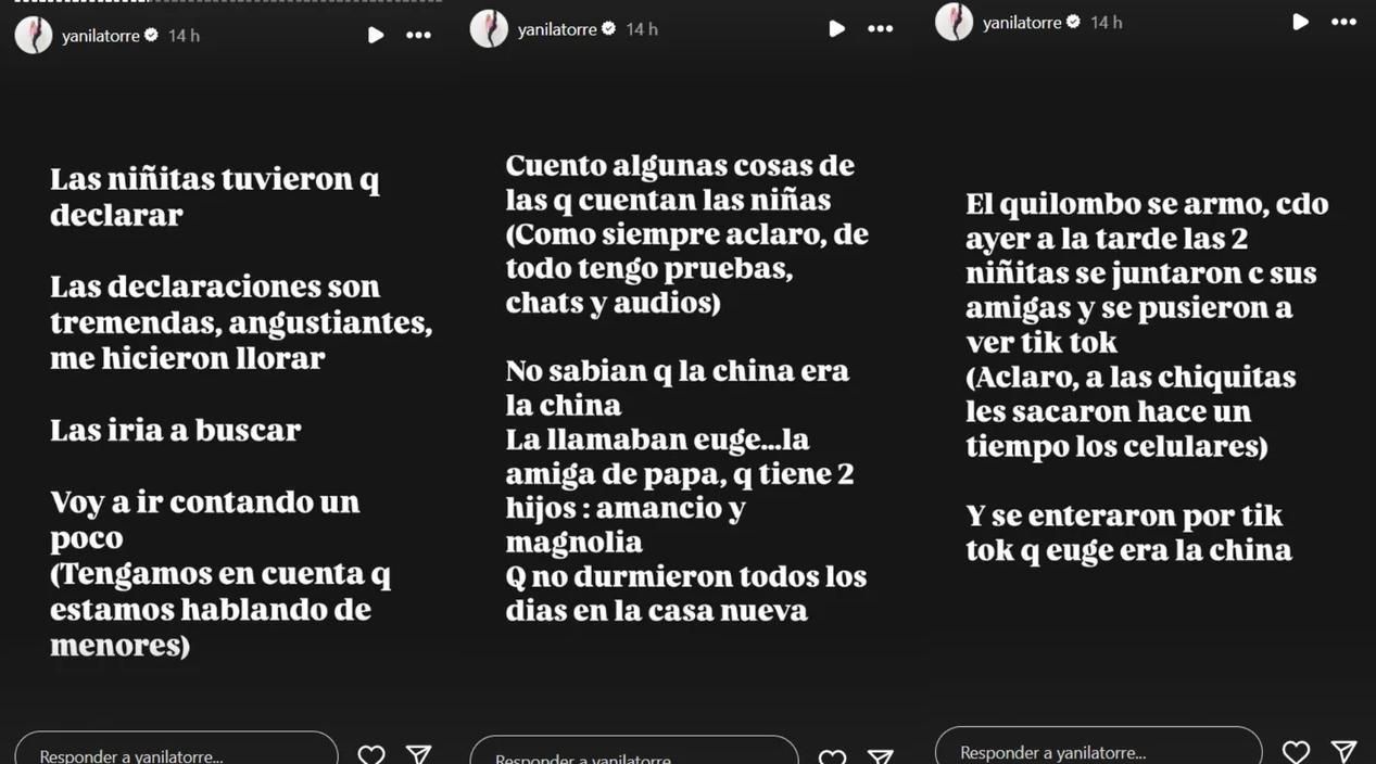 "Las niñitas tuvieron que declarar. Las declaraciones son tremendas, angustiantes, me hicieron llorar. Las iría a buscar. Cuento algunas cosas de las que contaron las niñas (como siempre aclaro, tengo pruebas, chats y audios). No sabían que la China era la China. La llamaban Euge, la amiga de papá, que tiene dos hijos, Amancio y Magnolia. Que no durmieron todos los días en la casa nueva", explicó la esposa de Gambeta.