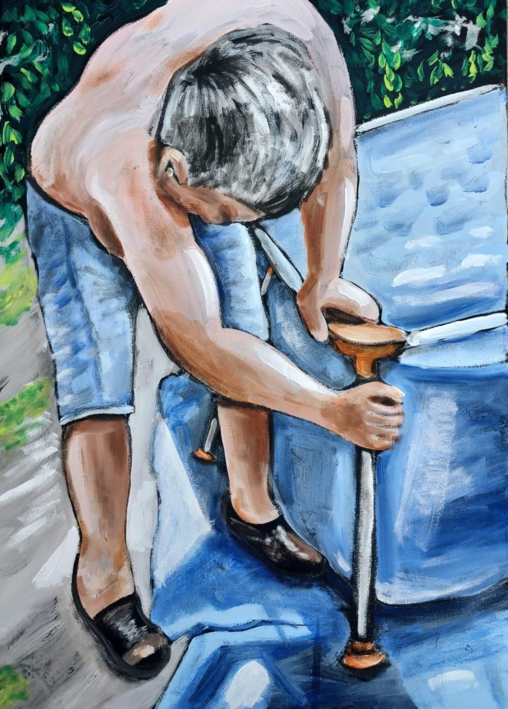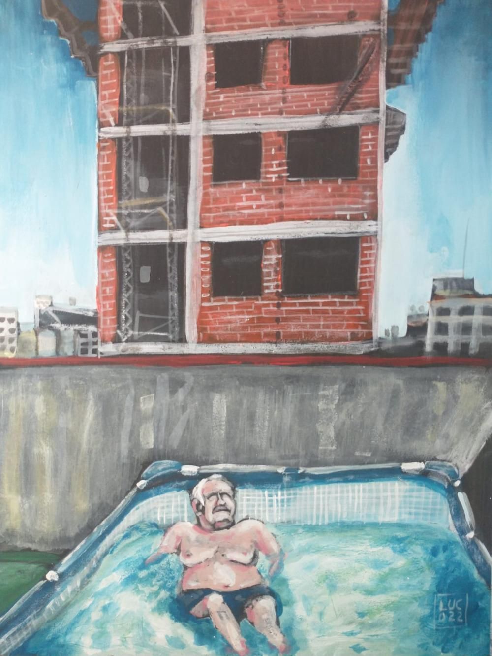 En los últimos años, Luciano pintó algunos cuadros en los que se puede ver a un auto haciendo de flete con una piscina de plástico en su techo, a un vecino armando su pileta de lona o a un hombre refrescándose en un paisaje bien del conurbano.