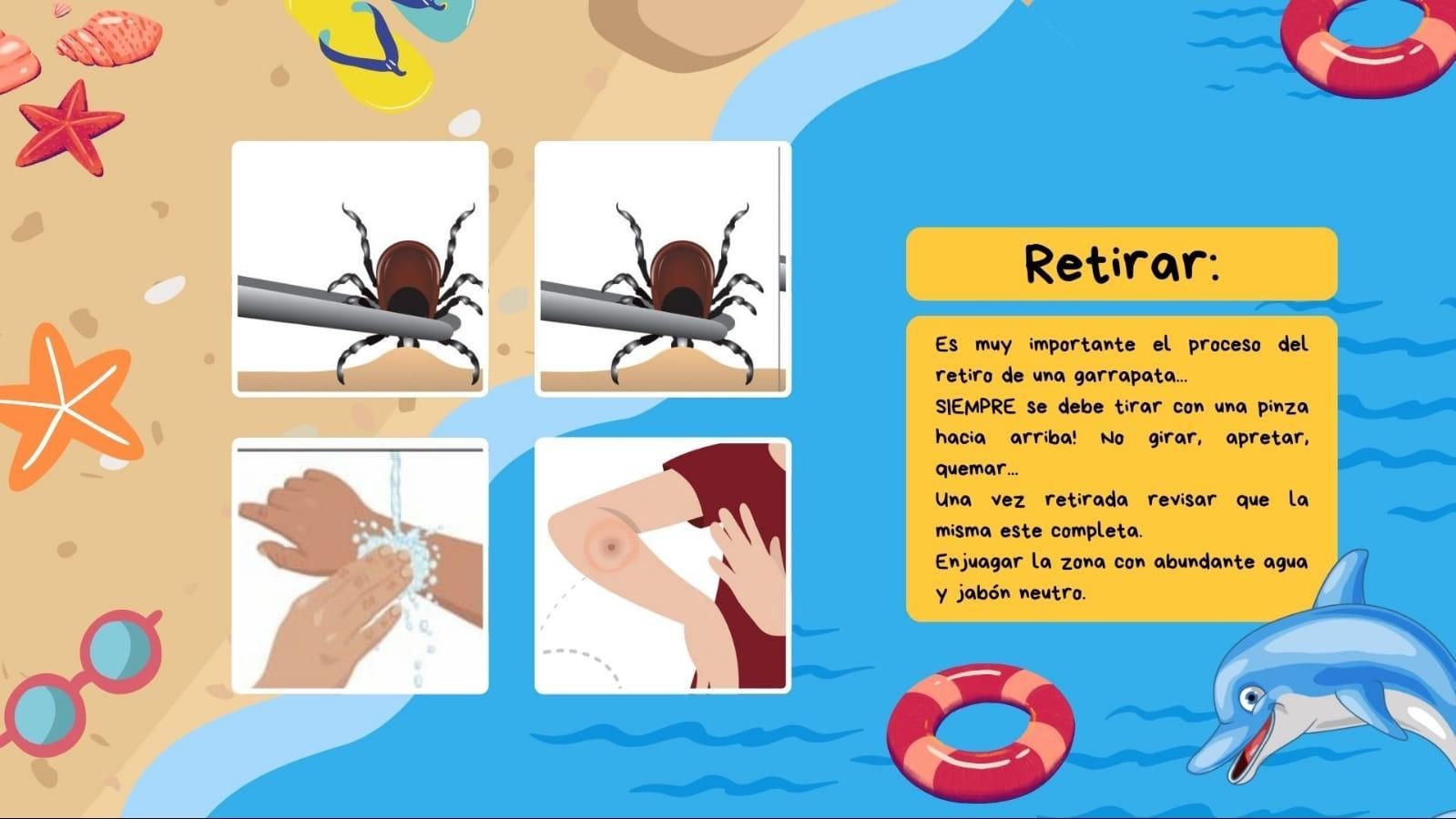 "Felices vacaciones sin garrapatas" es el slogan que eligieron para advertir sobre la presencia de garrapatas durante el verano ya que, en esta época, es cuando suelen salir de sus nidos para alimentarse. "Las garrapatas pueden estar en cualquier lado, ya sea en el pasto o también en la arena", aseguró Anabel.
