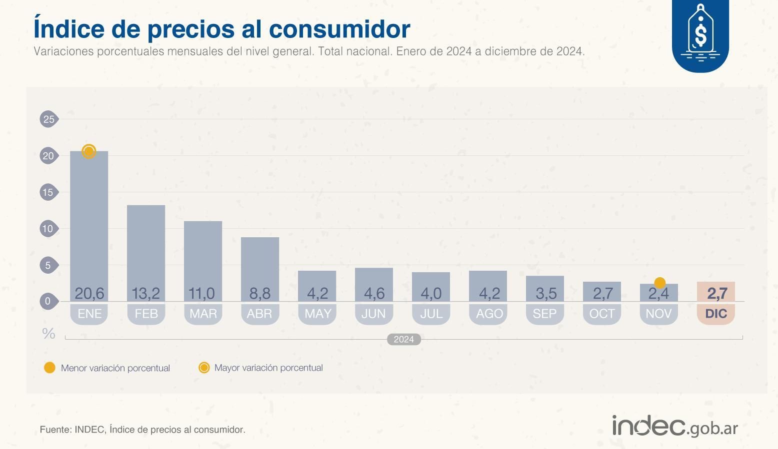 El nivel general del Índice de Precios al Consumidor registró un alza mensual de 2,7% en diciembre de 2024 (un repunte, porque en noviembre había sido de 2,4) y acumuló en el año una variación de 117,8%, según datos del Indec.