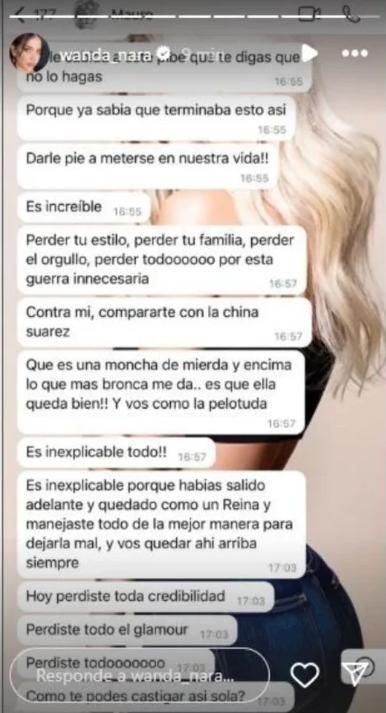 En las capturas de pantalla que difundió la misma Wanda, Icardi le reclama que la guerra mediática que estaba generando la está haciendo quedar mal; perdiendo su familia.