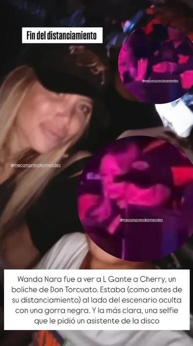 "Wanda fue a ver a L-Gante a Cherry, un boliche de Don Torcuato. Estaba (como antes de su distanciamiento) al lado del escenario oculta con una gorra negra. Y la más clara, una selfie que le pidió un asistente de la disco", informó.
