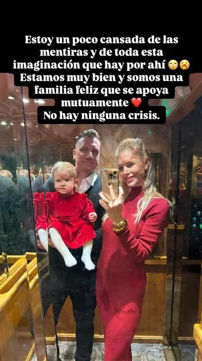 "Estamos muy bien y somos una familia feliz que se apoya mutuamente. No hay ninguna crisis", concluyó con una foto de ella con Maxi sosteniendo a su pequeña Elle, hija de la pareja.