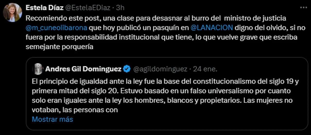 Desde su cuenta personal de la red social X, Díaz replicó una publicación del abogado y doctor en Derecho, Andrés Gil Domínguez, y sostuvo que las afirmaciones de Cúneo Libarona son "dignas del olvido" si no fuera por "la responsabilidad institucional" que lleva adelante y que convierte en "grave" publicar "semejante porquería" en diarios argentinos (haciendo referencia a una nota de opinión que escribió el funcionario para La Nación).