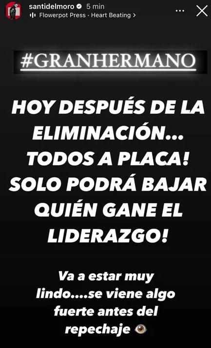"Hoy después de la eliminación ¡todos a placa! Solo podrá bajar quien gane el liderazgo", anunció Del Moro, quien anticipó que "va a estar muy lindo, se viene algo fuerte antes del repechaje".