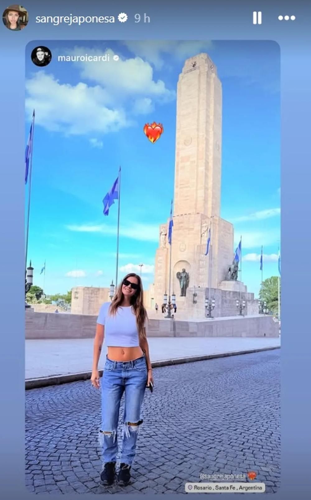 La China y Mauro se mostraron en la ciudad de Rosario, donde nació el muchacho. El delantero compartió una imagen de su novia posando frente al Monumento Nacional a la Bandera de fondo.