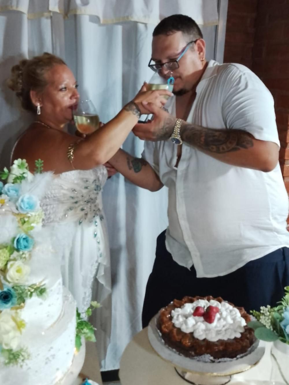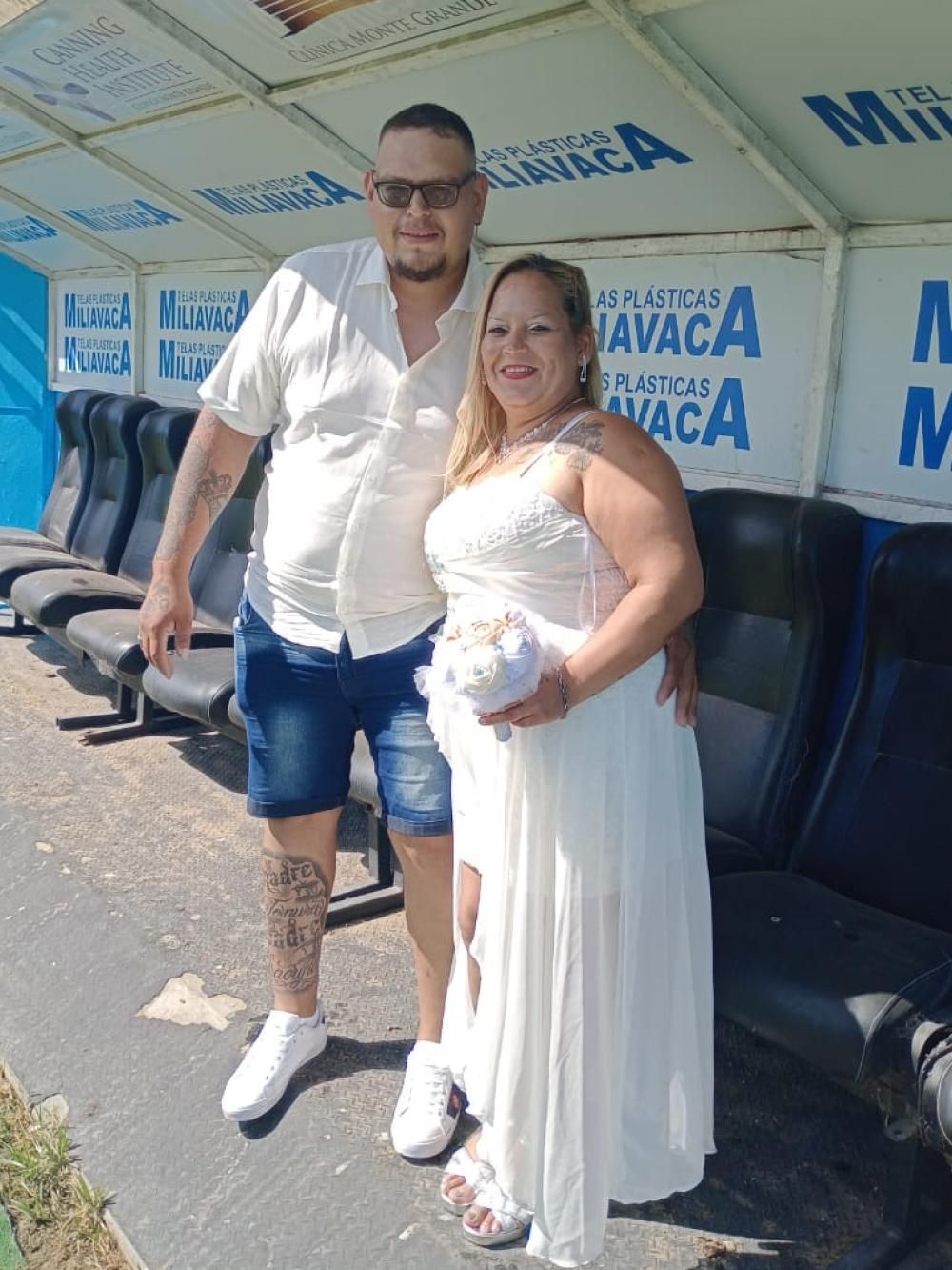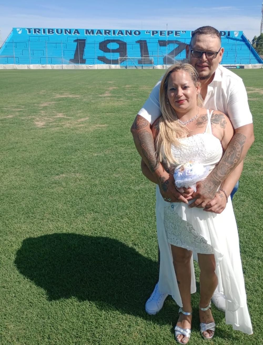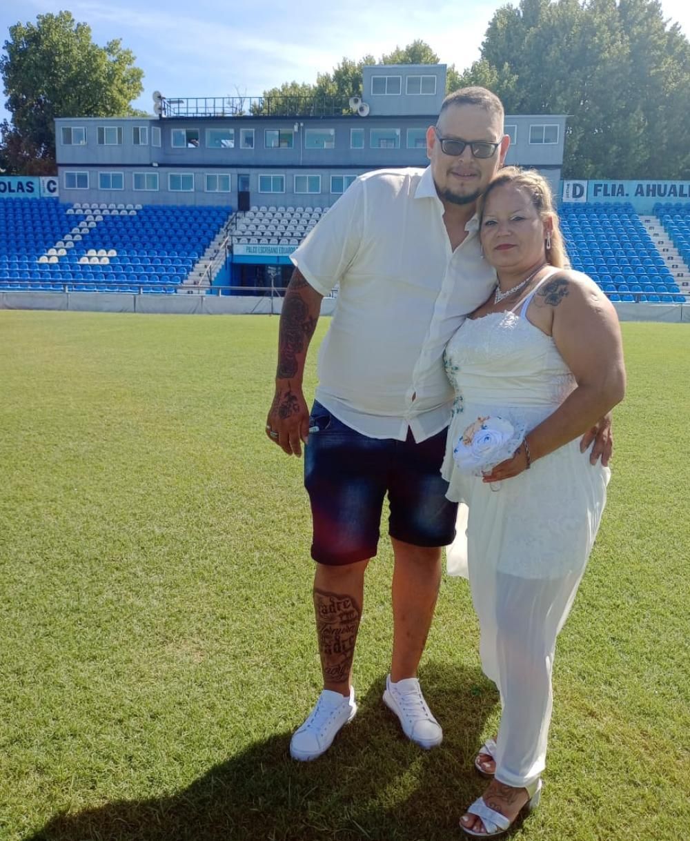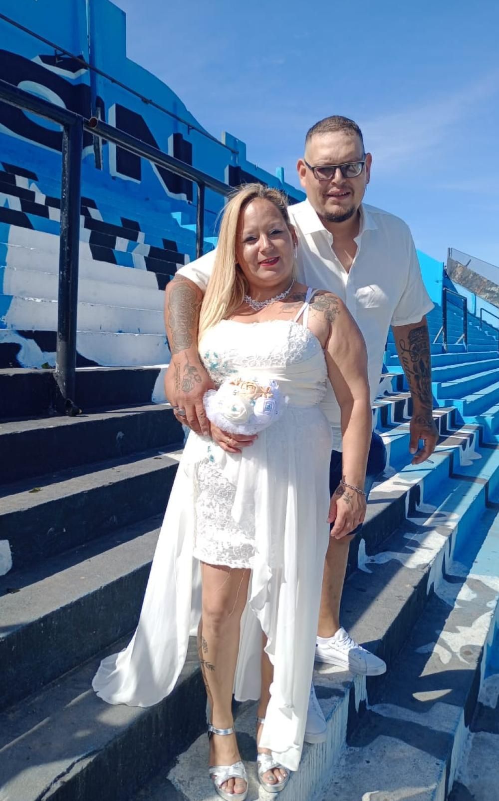 Si bien la pareja ya estaba casada por civil hace tres años, quisieron hacerlo por Iglesia y con el festejo muy especial porque a pesar que no viven en la zona -son de Almirante Brown- contaron que ambos son muy fanáticos del club: "Mi marido va a la cancha desde que era muy chico porque su papá lo llevaba en ese entonces y yo me hice un poco por él y porque un primo jugó en el Gasolero".