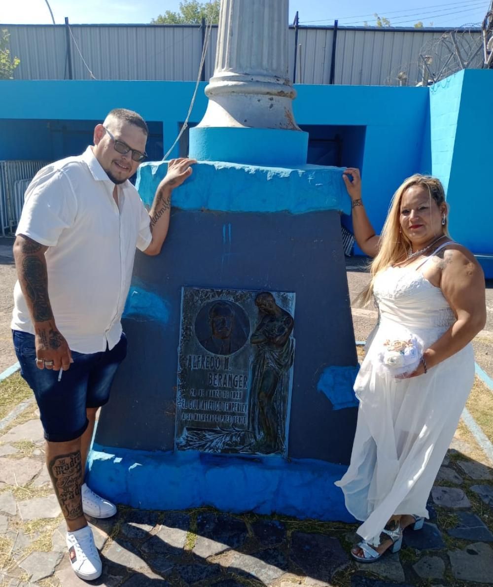 La vida en común de la pareja conformada por Daniel Omar Altamirano (32) y Gisela Alejandra Mereles (38) está atravesada por el color celeste porque ambos son hinchas y socios del Club Atlético Temperley y es tanto el amor hacia el Gasolero que pidieron especialmente poder tomar fotos en el Estadio Alfredo Beranger antes de casarse por Iglesia.