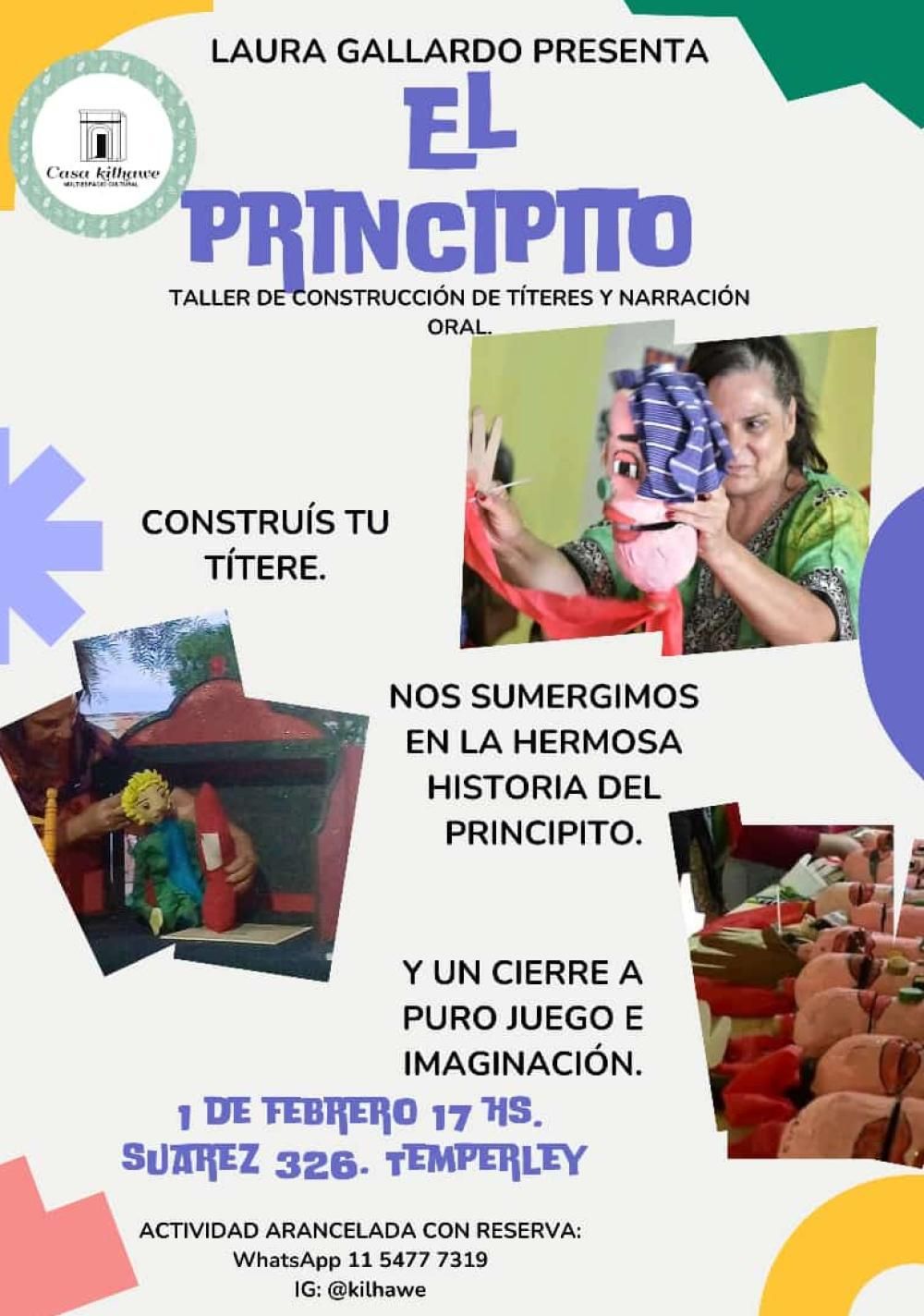 De la mano de la gran artista Laura Gallardo, este sábado a las 17 en Casa Kilhawe de Temperley, los más chicos podrán participar del taller de construcción de títeres y narración oral "El Principito" que es para niños a partir de los 3 años y será el primer encuentro del año que se desarrollará en el parque del lugar.