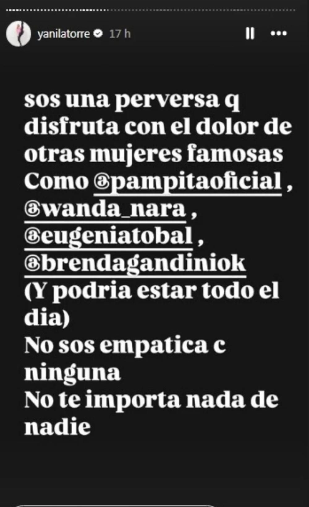 "Sos una perversa que disfruta con el dolor de otras mujeres famosas, como Pampita, Wanda Nara, Eugenia Tobal y Brenda Gandini (y podría estar todo el día). No sos empática con ninguna. No te importa nada de nadie", escribió citando a Brenda Gandini, la pareja del actor.