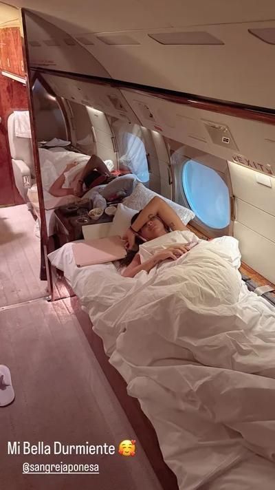 "Mi bella durmiente", escribió el delantero junto a una imagen de su novia durmiendo en una de las camas que tiene el avión de lujo.