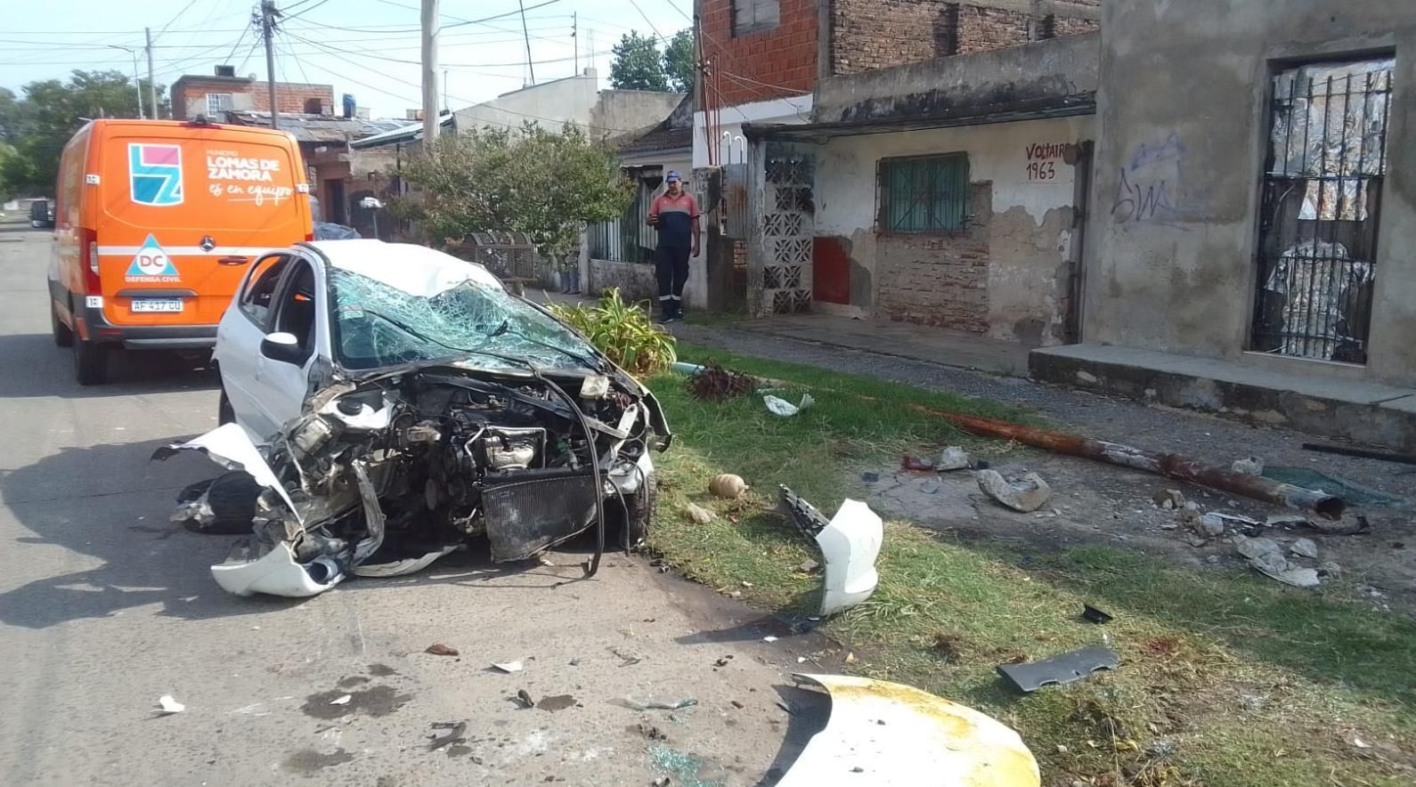 Un auto protagonizó un terrible choque en el Barrio Santa Marta de Lomas de Zamora. Tiró dos postes y también chocó contra el frente de una casa. El conductor se dio a la fuga.