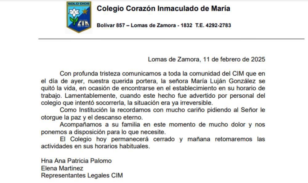 "Con profunda tristeza comunicamos a toda la comunidad del CIM que en el día de ayer, nuestra querida portera, la señora María Luján González, se quitó la vida, en ocasión de encontrarse en el establecimiento en su horario de trabajo. Lamentablemente, cuando este hecho fue advertido por personal del colegio que intentó socorrerla, la situación era ya irreversible", detallaron en la carta.