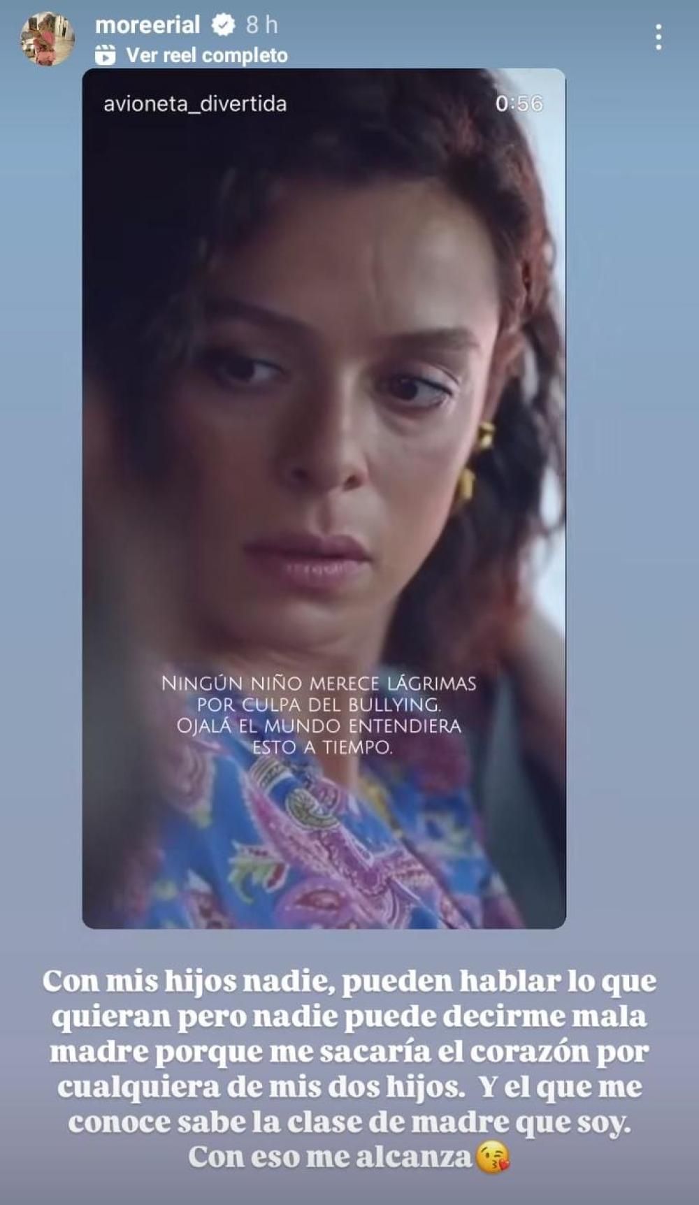 Como si eso fuera poco, a las horas subió una historia para repostear un reel referido al bullyng en los niños y acotó su mirada: "Con mis hijos nadie, pueden hablar lo que quieran, pero nadie puede decirme mala madre porque me sacaría el corazón por cualquiera de mis dos hijos. Y el que me conoce sabe la clase de madre que soy. Con eso me alcanza".