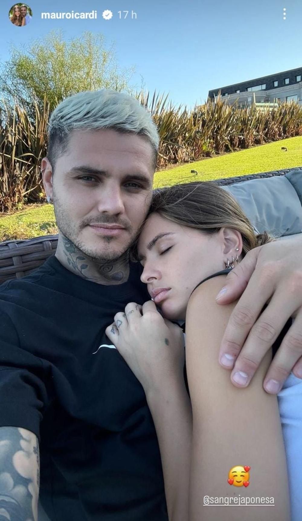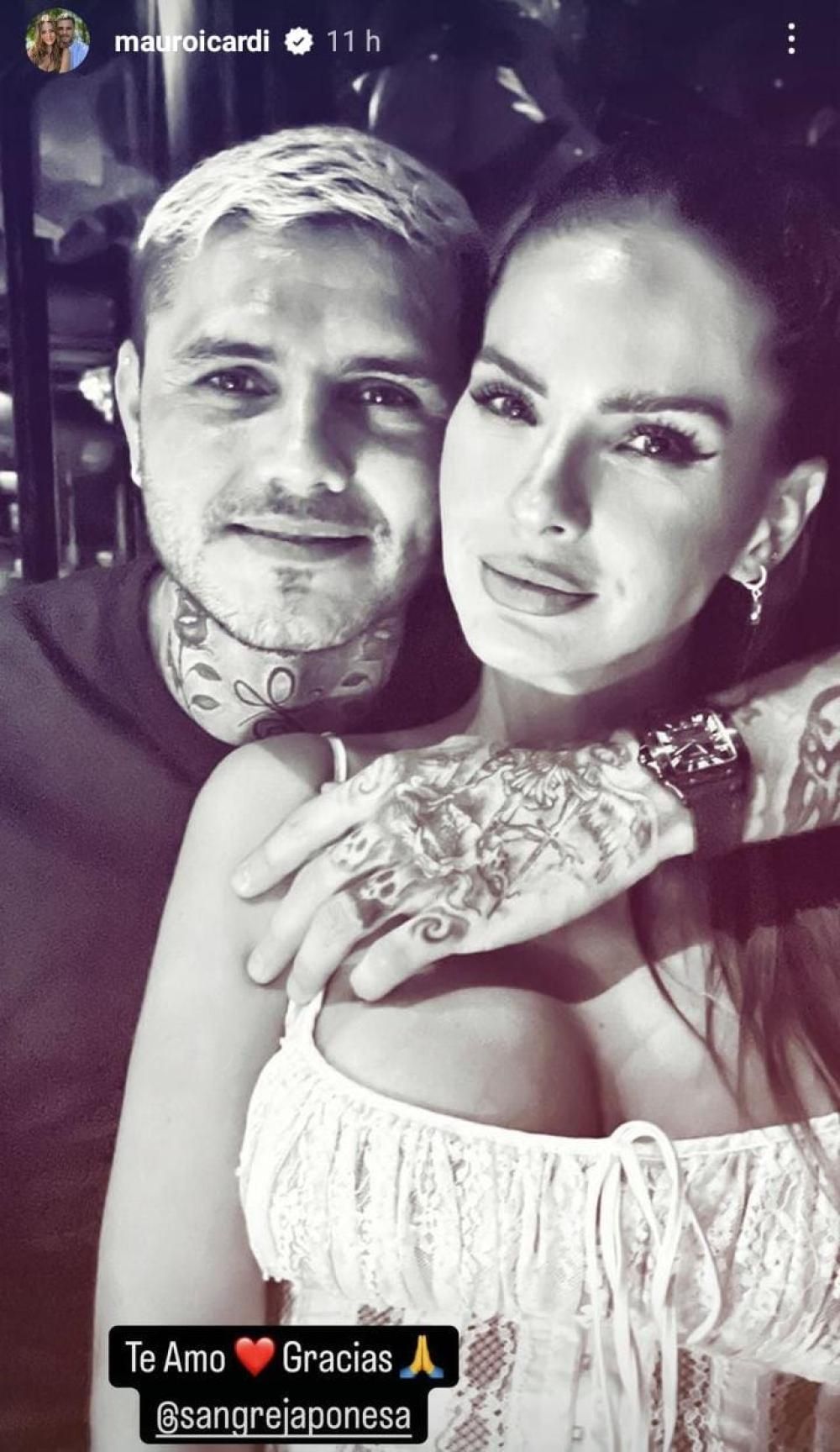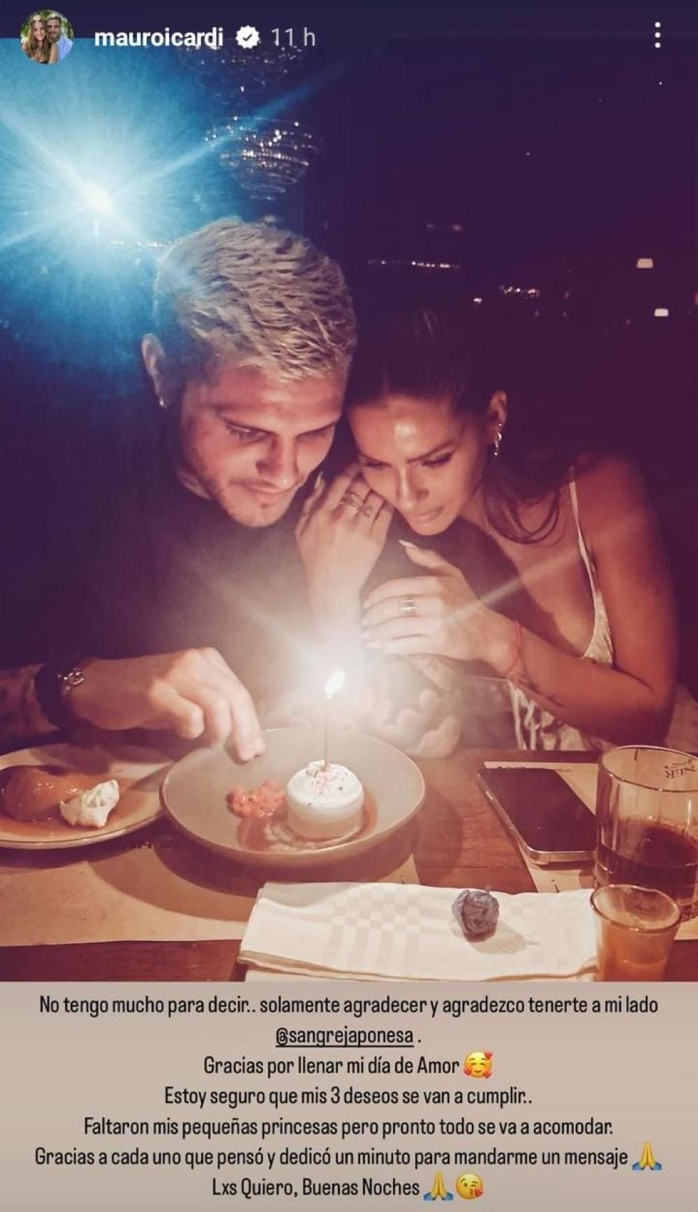 "No tengo mucho para decir…solamente agradecer y agradezco tenerte a mi lado. Gracias por llenar mi día de amor. Estoy seguro que mis tres deseos se van a cumplir", escribió Icardi en una de las historias en la que se lo ve compartiendo una torta con una vela encendida junto a su pareja.