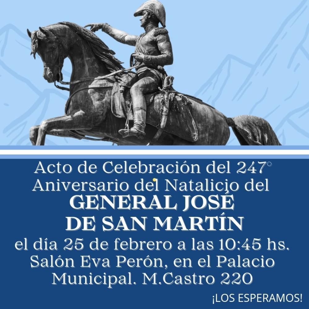 En el marco del 247º aniversario del natalicio del general José de San Martín, la Asociación Cultural Sanmartiniana "Campamento del Plumerillo" y el Municipio de Lomas invitan a los vecinos a participar de un acto para celebrar el nacimiento del Libertador de América. El emotivo encuentro se va a desarrollar el próximo este martes en el salón Eva Perón del Palacio Municipal.