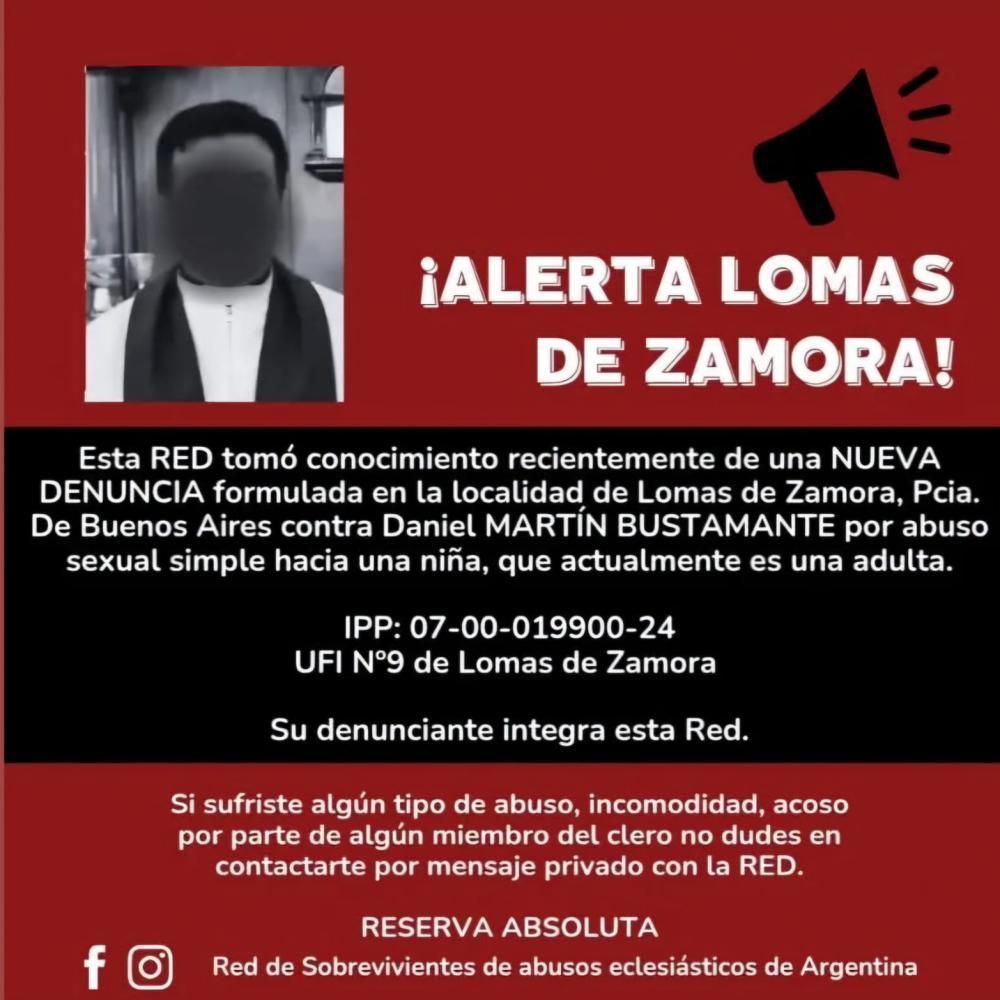 Según informaron desde la Red de Sobrevivientes de Abusos Eclesiásticos de Argentina, una víctima radicó una denuncia contra el cura de Lomas por un abuso ocurrido cuando ella era una niña.